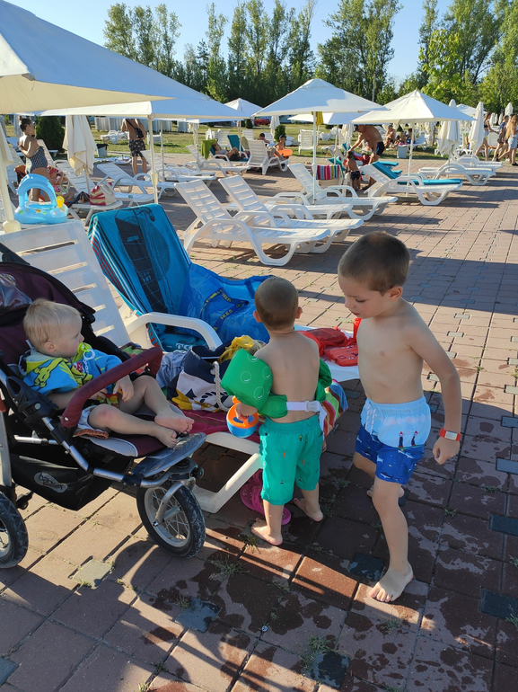 Трое и более погодковБассейны впервые в этом году у нас открыли 15 июля. Закрыли 1 августа. Снова открыли 10 августа. Пока опять не закрыли, решила поехать одна с тремя. Ну что сказать, это трындец, как и следовало ожидать. Месяц назад я успела побывать здесь же с одним Ильей, и это был действительно отдых, он игрался, я следила, даже лежала, муж в выходной с младшими дома остался, ему по медицинским показаниям на бассейн нельзя. С тремя контраст налицо. Дома договорились, что в бассейне держимся все вместе. Никто плавать не умеет. Если Леша идет туда, то мы гуськом за ним идем туда же. На словах все согласились.