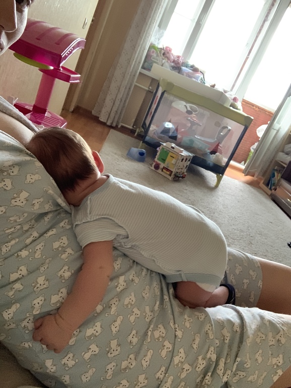 Остальные свои сны Миша спит где попало🤣 То в шезлонге, то на диване, то в кровати уложим, то на груди у меня лежа на животике, ну или в коляске если идем на улицу.