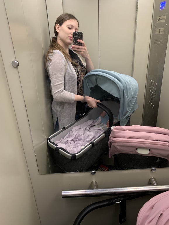 Сразу там сидит Ксюша, я прижимаю коляску к стене, сама держу рукой и ногой лифт чтобы не закрылся и беру люльку с Мишей.Так едем вниз.