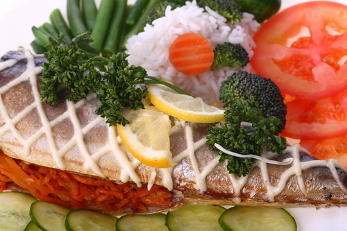 Мы говорили о том, что для похудения и оздоровления органов пищеварения, . Другими словами мясо нужно кушать с овощами без углеводного гарнира, а крупы и мучные изделия без мяса. Однако рыба - это исключение из правил. Ее вы можете кушать с любой углеводной пищей: макаронами, гречкой, рисом, картофелем, не говоря уже о чечевице, горохе, фасоли, нуте (продуктов с большим содержанием растительного белка). Все дело в жире, содержащемся в рыбе - омега-3 и омега-6. Эти ненасыщенные жирные кислоты преобладают в растительных жирах. А углеводы как раз и сочетаются с растительными жирами. В таком сочетании они легко усваиваются и при умеренном употреблении не вызывают ожирения. Именно поэтому вы спокойно можете употреблять рыбку с гарниром. Однако не забывайте, что в этом приеме пищи не должно быть животных жиров. Если вы только начинаете разделять белковую и углеводную пищу, то именно рыба поможет вам постепенно отказаться от привычного сочетания мяса и гарнира.