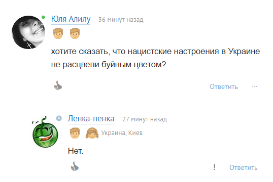 Юль, а аппонент тебе что то ответил на комментарий? Мне интересно хоть кто нибудь из украинских ббэшек что тут пишут признавал хоть раз свою неправоту или как обычно игнор в ответ на неоспоримые доводы?