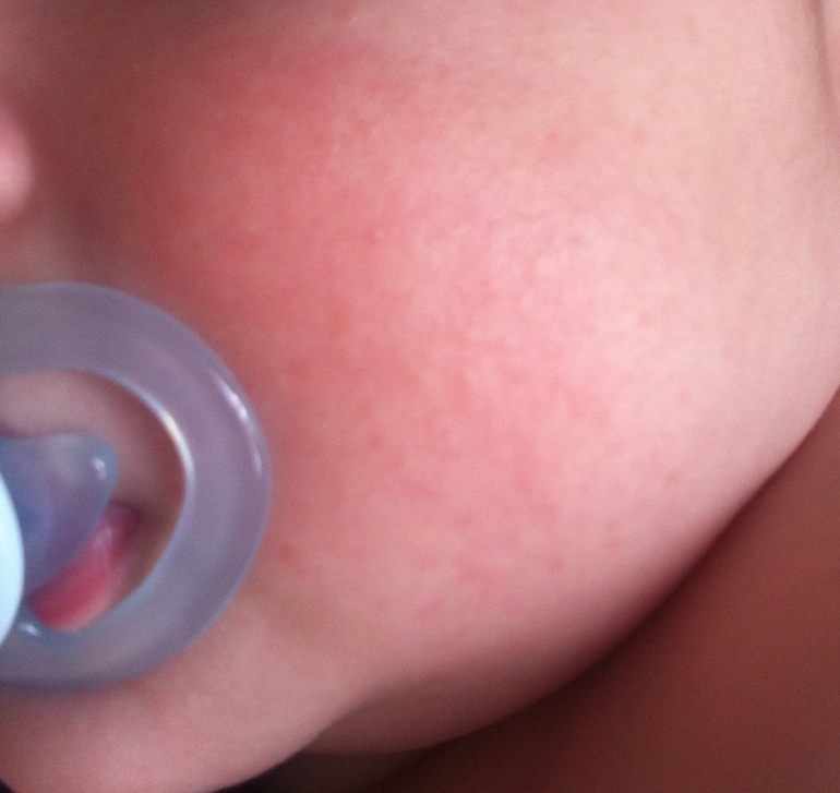 Оооооо, у нас такое! Врач сказал потница. Заварить в кружке слабую череду (буквально щепотку) и марлечкой протирать лицо. Как вспомнили - так и протерли! К вечеру уже были светлые щечки. Но потница все равно появляется т.к у нас оч жарко, но уже не так сильно обсыпает. Каждый день несколько раз протираю.