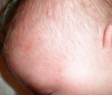 Высыпания на кожеДевочки, вот сфотографировала свою дочу, чтобы вы мне сказали что это: аллергия, потничка или возрастное "цветение". Нам в воскресение месяц стукнет и вот мы покрылись такими прыщиками и это только на личике и на головке, а на теле все чистенько ттт... У кого также было, что это?