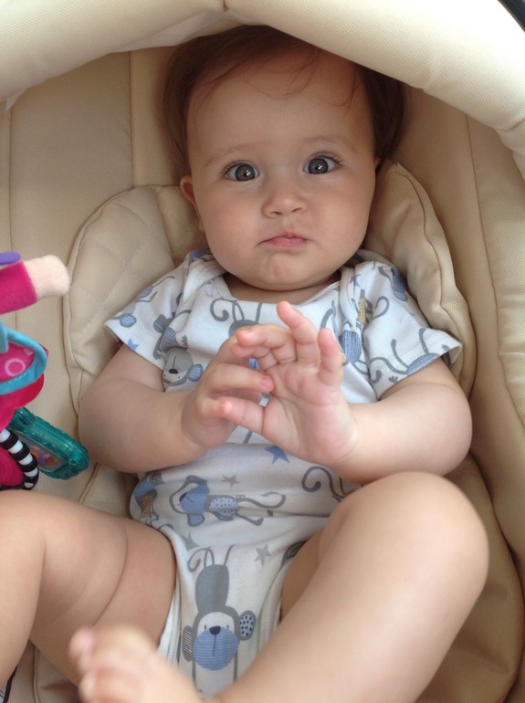 По умелкам: перестали крихтеть, когда переворачиваемся, лежим на животе или ползаем. АКДС с гепатитом Б сделали одним уколом и в этот раз в левую ногу. Гематомы не было, так что на наши умелки не повлияло. Сесть, пока не сели, только попытки - постоянно за ручки встает в ванной и на стульчике своем, когда кормлю; на ручки только стали полностью опираться, лежа. Начали пить с поильника с крестиком (купила Fiszman). Вчера уже освоили и трубочку, но пока думаю буду еще в поильнике давать, уж очень грубые трубочки пока (пили с упаковки, поильник с трубочкой пока не покупали). Из умелок еще мы, хоть и не сидим и толком не ползаем, зато начали бегать и гонять наш мяч в 75 см. По прежнему любим заниматься на мячике: прыгать, кататься, доставать игрушки... Научились щипаться, так что теперь мы не лезем пальцами в мамины глаза, а щипаем ее за нос. Усердно все тащим в рот, все, что под руку попало (край коврика, телефон, штангу от качели, ножку от гладильной доски...). В планшет лезет пальцами постоянно. стоит только его положить рядом. Нашли свои волосы, постоянно, когда психует, их дергает, в прочем как и уши. Из лепета добавилось: пфа, папапа, ооооооо___во.... На водных процедурах стали активничать: брызгаемся (хлопаем по воде) и ловим пузыри. Научились хмуриться и фыркать, как ежик. Теперь, когда недовольны, хмуримся и фыркаем. И на солнце вечно фыркаем - "десна сушим". Кстати пока у нас они еще без зубов. Ну на этом пока все!