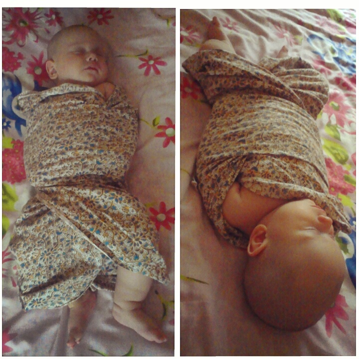 Пеленку кладу ромбиком, те получается 4 угла-голова, рука, рука, ноги. У меня она квадратная. Одну руку выпрямляю, ткань в противоположную сторону тяну, под бок и попу заправляю, прижимаю второй рукой, оставшийся кусок тяну и закладываю под спину, цепляю кончик в складку, при этом на верхней слое делаю типа вытачки(складки) на груди, чтоб остаток хорошо грудь и живот охватывал. А ноги и остаются свободные