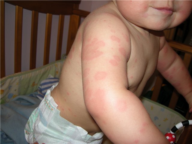 началось все с одного небольшого пятнышка на животе, записались к врачу, больше недели ждали (у нас если ты не присмерти, то жди...) в итоге этих пятен стало много,не так конечно как на фото, но много.. Ничего не давала, ждала врача и назначения.. В итоге кроме как -аллергия ничего путного не услышала, сказала искать аллерген, вкололи супрастин с преднизолоном и пить 5 дней супрастин назначали ..Где искать, как ,ума не приложу.. Из еды ничего нового не давала , косметика такая же... если б на что то из домашнего была аллергия, то она б раньше проявилась..Скорее всего я что то не то съела..Но опять таки, ничем особым не питаюсь, обычный рацион.........В общем ломаю голову......Единственное что вспомнили что несколько месяцев назад у ребенка появлялось подобное пятно, размером со спичечную головку, но не успели мы его педиатру показать - исчезло пока очереди дождались....Так как нам вычеслить на что аллергия? . Однозначно купать без шампуней пока, я буду в сто раз внимательней к своей еде, за еду ребенка(прикорм ) я уверенна., стирать детские вещи чем? Сейчас тайдом для детей все стираю...Руками я с ума сойду стирать все мылом хозяйственным(и не факт что оно безвредно) , животных в доме нет, хотя во дворе живут собаки, но ребенок их не трогает(да и я очень редко ).........В общем нужен совет мам у кого дети аллергики..Как вычисляли?