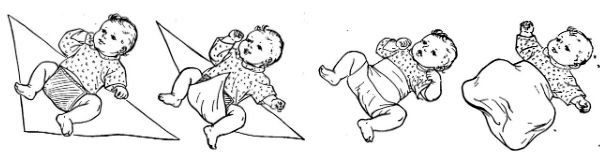 Первое узи суставов мы сделали когда Маше было 3 недели.Угол наклона был 56 градусов с обоих сторон. Нормой считается показатель от 61 градуса, но у деток до 6 недель допускается больший разброс значений. Так что дисплазию в тот раз нам не поставили, но предупредили, что если ситуация не изменится, мы имеем все шансы заработать этот диагноз к следующему узи в 6 недель. В качестве профилактической меры назначили широкое пеленание. На первый взгляд это звучит не так и плохо, но я сейчас объясню принцип метода. Идея в том, что между разведенными ножками ребенка кладется плотная пеленка, сложенная в несколько раз прямоугольником, которая затем фиксируется второй пеленкой. Как-то так:
