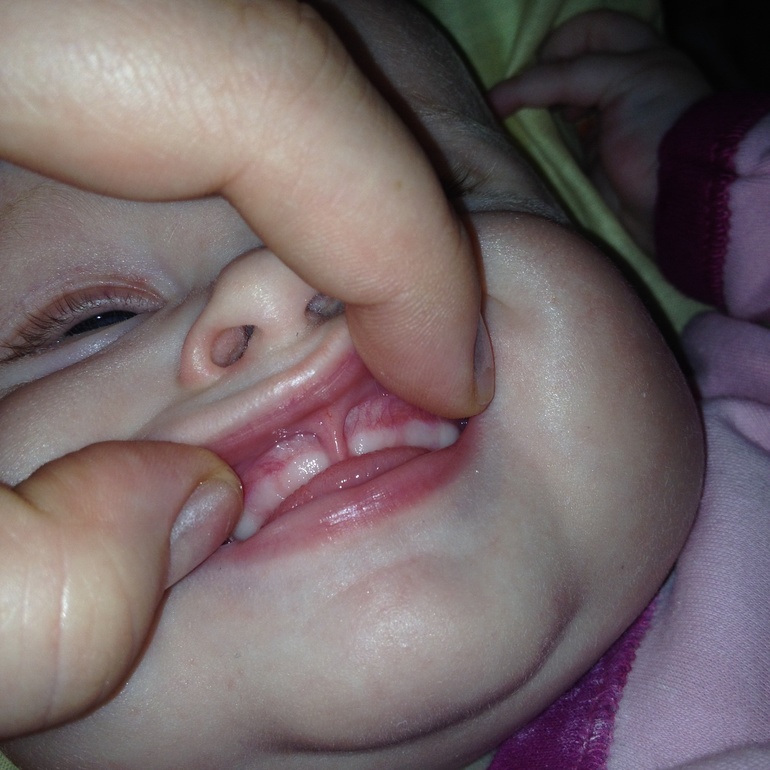 привет! У нас зубки верхние режутся, но меня смущает то, что белеют 6 (!) зубиков, причем сильнее белеют боковые резцы. Выкладываю фото, посмотрите, может, я не права , и зря паникую и до зубов долго . А то у нас море слюней, иногда температура ( сходит быстро) , чешем десны, всё в рот тянем и море соплей, дышать и спать не можем нормально(((Наталья