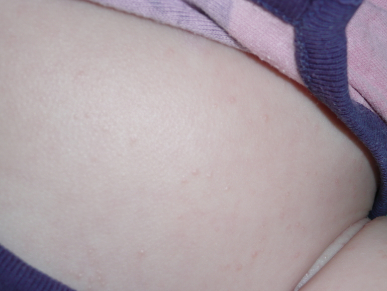 Похоже на потницу, нужно часто водичкой протирать, если потница достаточно 3-4р, то начнет исчезать, а без изменений аллергия.