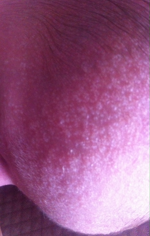 Это просто тонкая кожица которая со временем слезает и под ней скопился пот...Дети же облезают постепенно после родов,та кожа что была в воде она слезает,шелушится..А вы нагрели ребёнка и под этой отмирающей кожицей скопился пот...Купайте,умывайте,не давайте потеть,следите за правильной температурой дома..Всё пройдёт.