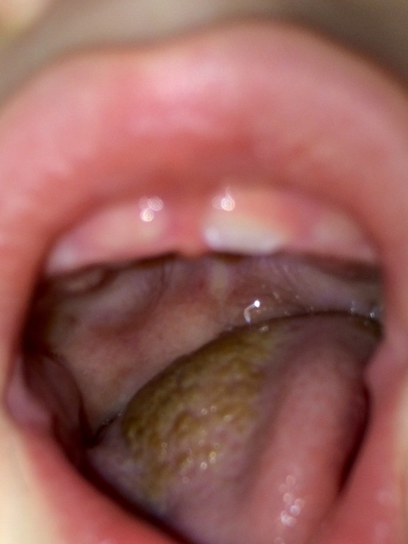 РазноеПоявился светло жёлтый налёт на прошлой недели,в этот вторник приём педиатра она посмотрела и сказала"язык отражение жкт",дала направление на кровь,копрологию и УЗИ. Кровь сдали вчера ещё не пришла,УЗИ сегодня ничего не показало,все в норме. Кал еще не сдали. Самое не приятное то что она нервная,и язык налёт темнеть стал,плохо какает,эти несколько дней вообще от прикорма отказалась ребёнок,крутит головой и закрывает рот,ничего со стола не просит как раньше,воду и соки не пьёт (например как старший сын в её возрасте)ну соснет бутылку и выплёвывает играя с ней. Только грудь и все. Фото под катом. Я уже голову сломала эти дни,может у кого-то было похожее? Сфотать младенца рот сложно но тем не менее картина ясна,дальше по языку больше налёта.