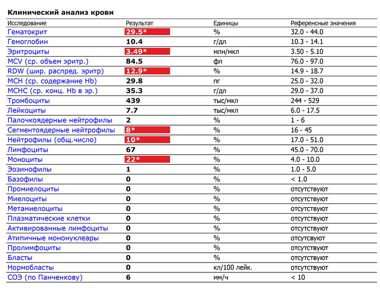 Немного низковат гемоглобин и цвет.показатель. Нижняя граница 110. У вас 104. Я бы на это закрыла глаза)) Нагуляете и наедите)) Высокий показатель моноцитов говорит о том что у ребенка идет нарастание иммунитета( после болезни,например). Но я бы этому показателю не доверяла, т.к.анализ делался только на гем.анализаторе(он иногда путает лимфоц.и моноциты.Они у мал.детей очень похожи).Не буду нудить с этими терминами))