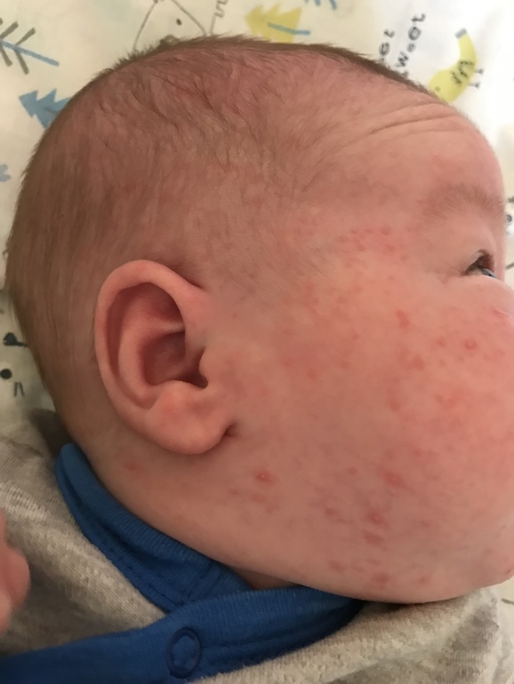 У нас также было,думали акне, но затянулось,сыпадо ужасно. Поменяли 4 смеси, пока не поишли к Нэнни (коза),все прошло. Решили,что аллергия на бкм,но надо проверять.