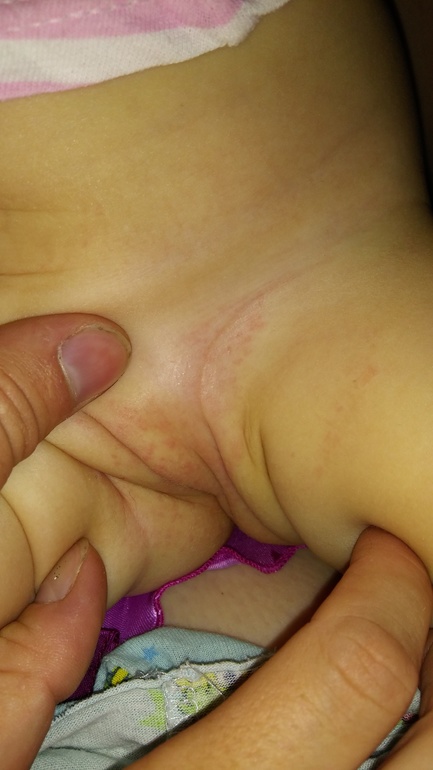 сегодня почти все прошло.скорее всего опрелость...на даче +30 было...а пока в памперсе....