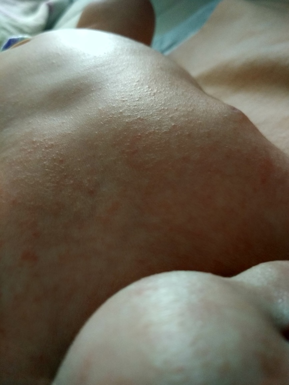 За полторы недели лечения и такого питания ничего не изменилось. То краснее, то бледнее, но сыпь все равно есть. Судя по картинкам с просторов интернета, на классический АД наш случай не очень похож.