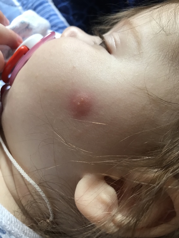 У нас от укусов пузырьки бывают. Но вот объём меня бы смутил. Надо врача а то может там нагноение внутри
