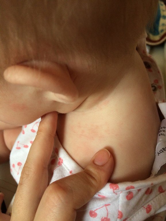 Скорее всего она. Болели ей все три дочки. Первая в 10 мес . А двойняшки прям недавно в 4 мес. Сыпь так же- на теле, на волосистой части головы, ушах. Руки ноги чистые.