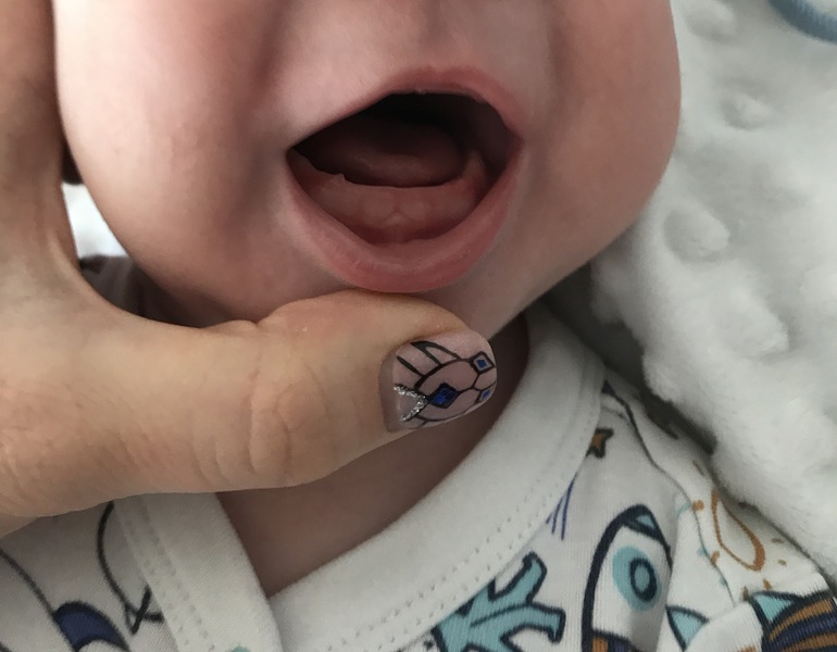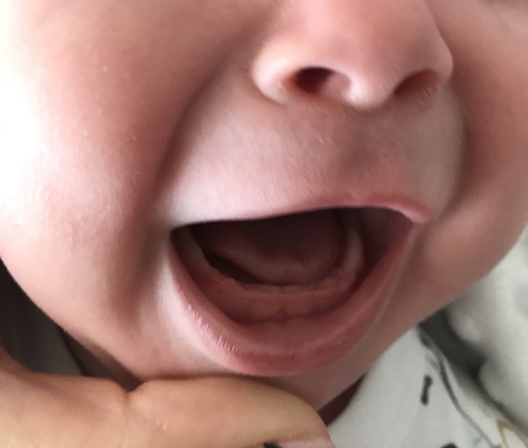 Не) полосочки под зубы можно увидеть, если ребёнка положите, а сами ляжете у его головы так, чтобы он смотрел на вас снизу вверх и наоборот)) рассмешите его, и нижнюю десну прекрасно видно. То, что на фото, здесь только десна. Не видно. Нужно смотреть именно туда, где зубки вылезают. Если там есть полосочки, значит скоро. Если десна как десна, как обычно, вся однородная, значит просто двигаются там)