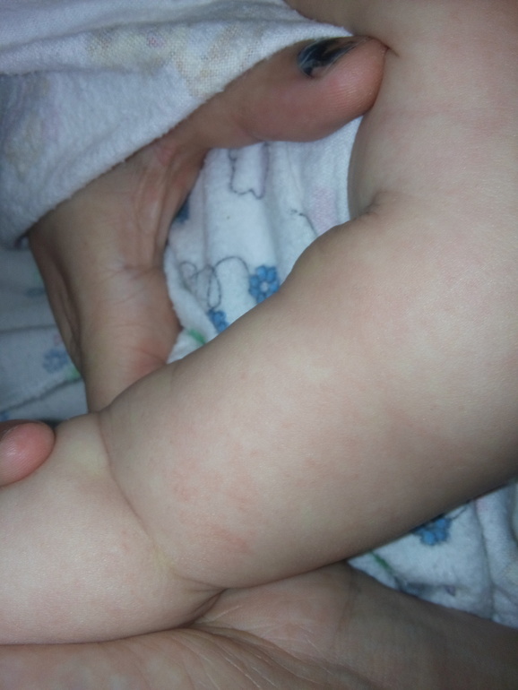 Высыпания на кожеДевочки, у дочи пневмония, колем гепацеф с новокаином, началось непонятно что, я в панике. На коленках , как нам кажется, от ползания, а по телу что это? Аллергия? Розеола? Атопический дерматит??? Помогите, пожалуйста