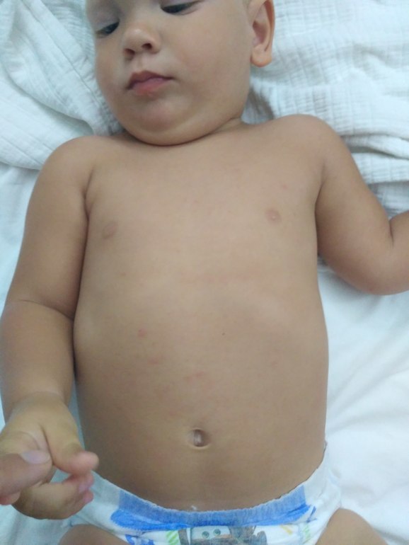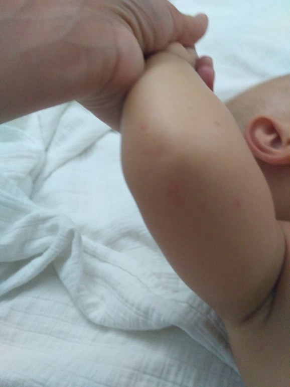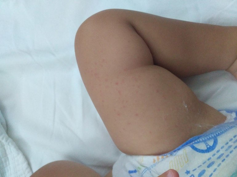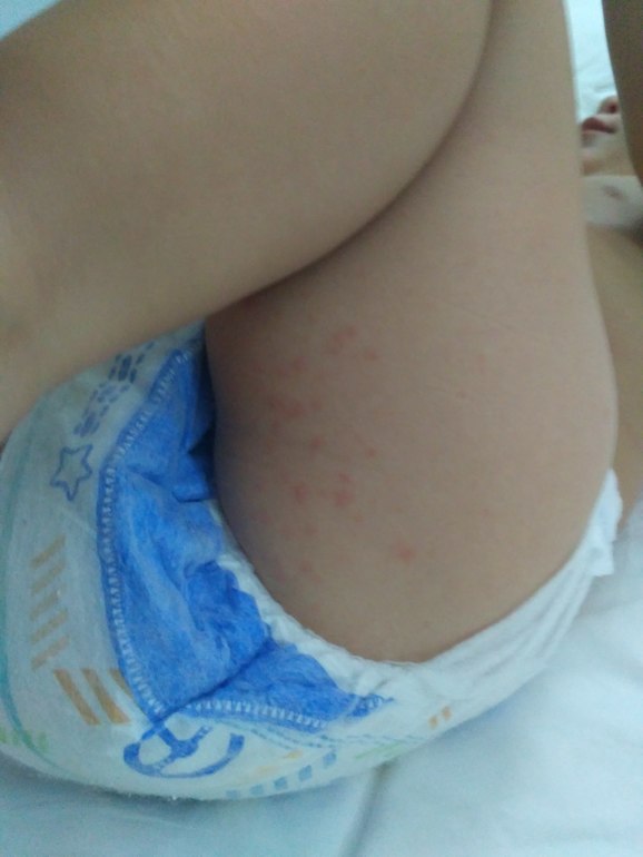 Высыпания на кожеСыпь у ребенка на ногах от попы до коненки. Немного на животе, на локтях, на спине у шеи. На данный момент находимся в отпуске. Сыпь началась с паха со 2 дня отпуска. На 4 и 5 день температура от 38.5 до 39.1. Свечами 4 раза сбивали. Думаю температура из-за зубов - нижние клыки на подходе. Вот сыпь смущает очень. На Коксаки не похоже. Контактное? Ребенок в трусах или шортах и майке. На море на песке сидит камушки собирает. Соленая вода/камни/песок могут такую реакцию давать? Косметику не меняли. Защита от солнца в прошлом году использовалась, реакции не было. 2 ночи ребенок просыпается с плачем, долго не успокаивается. Но опять же - руки в рот - думаю из-за зубов. Вчера свечку поставила чтобы обезболить. После этого уснул. Сыпь его не видно чтобы беспокоила - не чешет. Что это может быть и чем спасаться? Д-пантенол не спасает