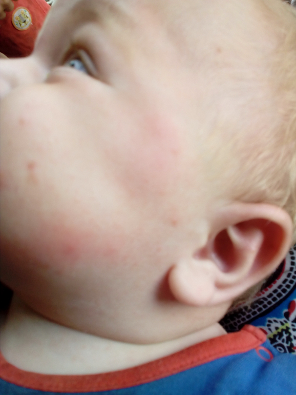 АллергияДоброго утра,мамочки)У нас неделю назад появились пятнышки,на ощупь твердые,думала сначала,что это просто укусы,но они никак не проходят.Нового вроде ничего не вводила,в некоторых пятнашках заметна водичка.Возраст 7 мес,прививок нет,прорезался зуб несколько дней назад.Фото вставила с трудом