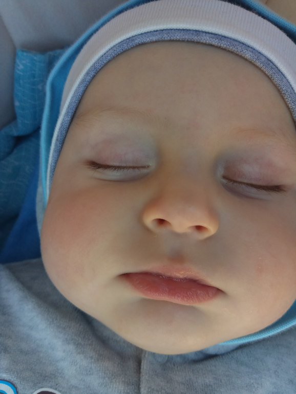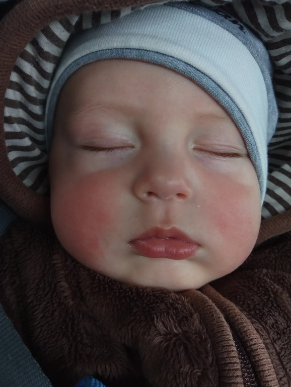 Правая щечка красноватая немного,на лбу сегодня появилась оооочень мелкая сыпь,и на бровях тоже-ее не много,но она есть!