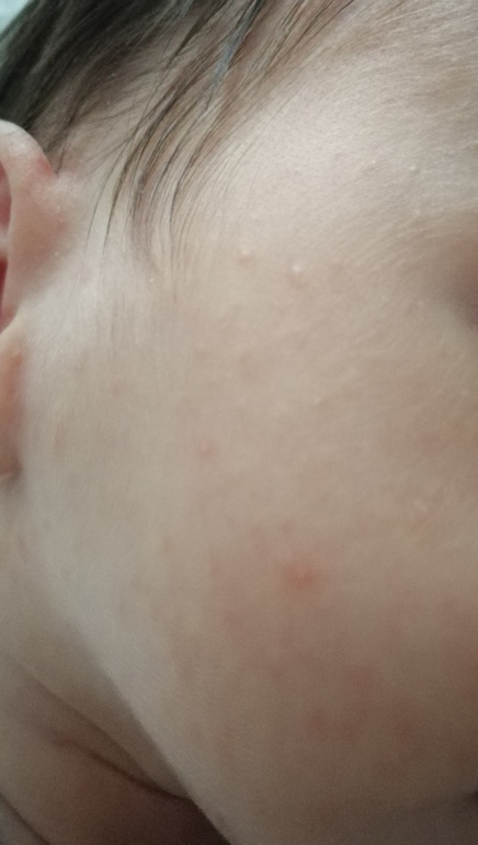 Высыпания на кожеДевочки, добрый день. Малышке месяц, появились дней 10 назад красные прыщики в районе шеи,думала потничка, сейчас они и на лице и за ушкам. Что это может быть такое и надо ли это лечить. К врачу попадем только 6 декабря. Спасибо за комментарии.