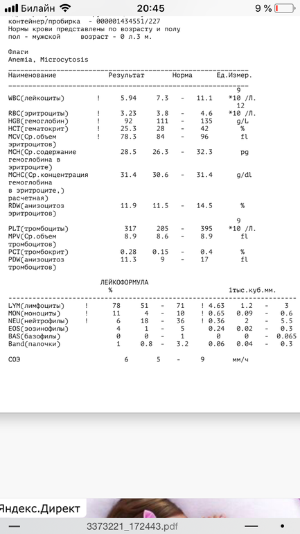 Как минимум гемоглобин низкий,ну и другие показатели...