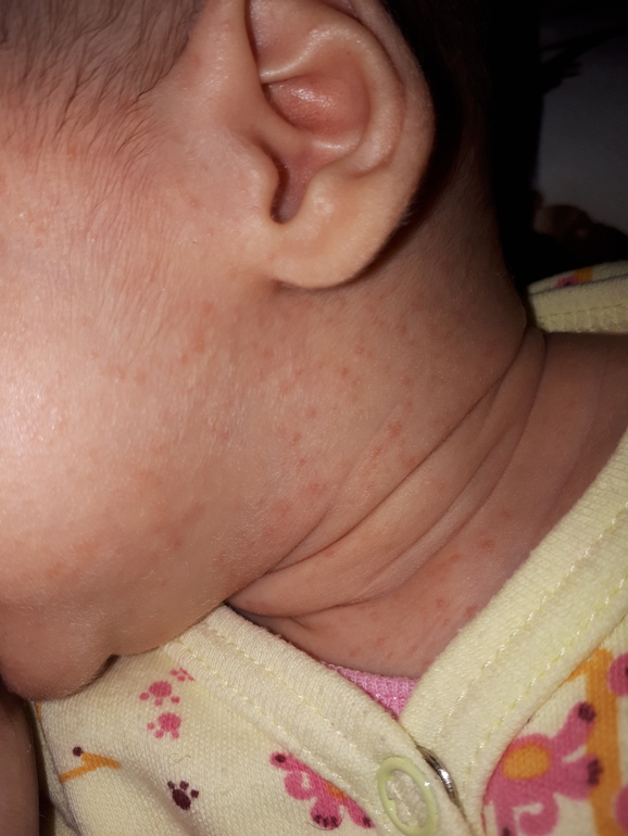 АллергияДевочки ребенку 40 дней. Последие несколько дней высыпало на щеках, шее и груди. Не пойму что это. У нас СВ докорм смесью. Смесь Фрисо 1. Но она была еще с роддома. Я исключила в своем питании опасности. Что это может быть?.