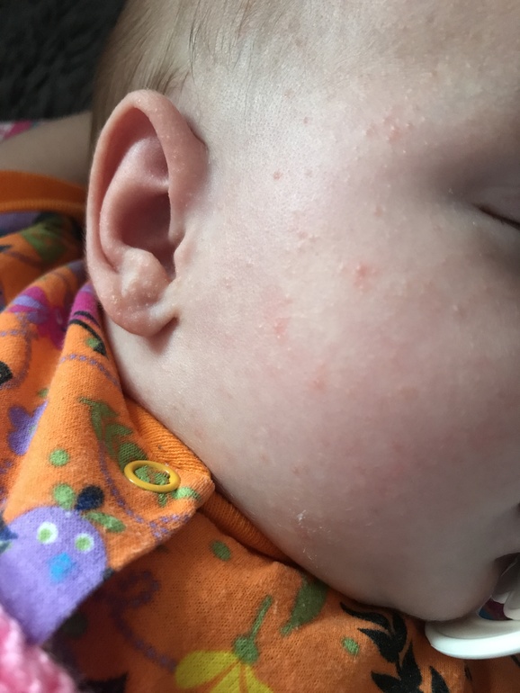 АллергияНам почти 1,5 месяца, примерно неделю назад(может чуть больше) появилась сыпь в виде прыщиков на лице, ушках, голове и шее, на теле ничего нет, кожа чистая.