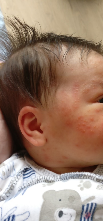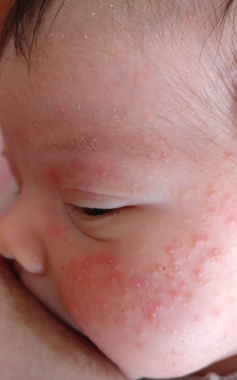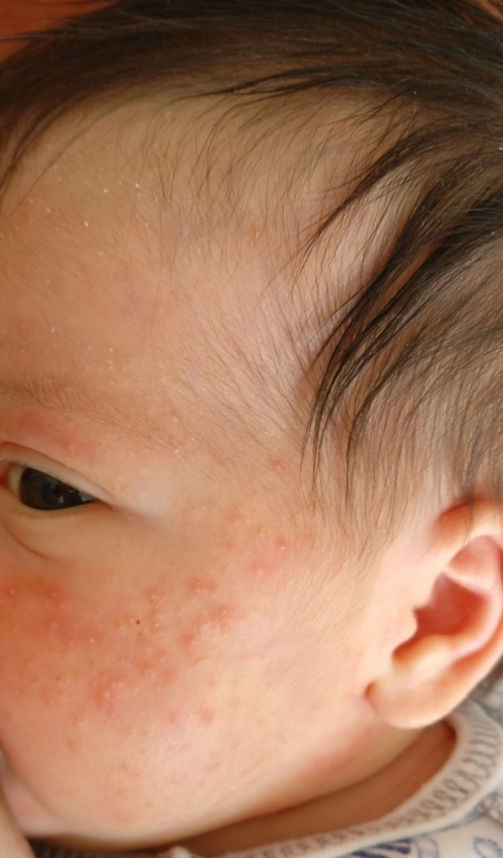 У моей крохи в три недели начало высыпать на лице и шее, прыщики с белыми головками, на щечках точки черные (как у нас на носу почти), все это в обрамлении красными пятнами...