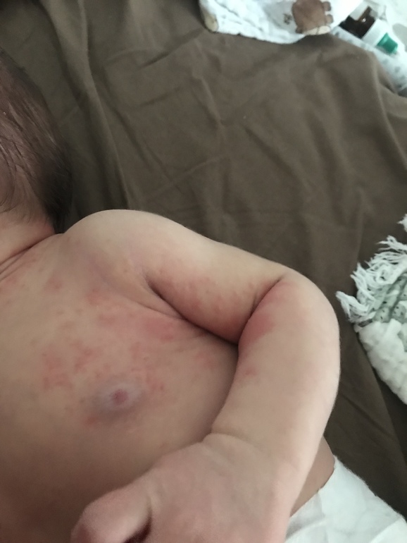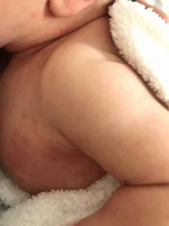 У нас была эритема в роддоме, сказали, что так бывает, когда мама в последние месяцы кушает много сладкого или цитруса, в общем аллергенов. Потом эритема сама прошла