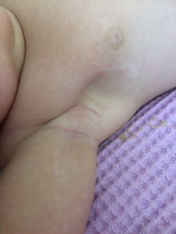 Высыпания на кожеДевочки, нужен коллективный разум! Ребёнку 5 месяцев. Заметила на коже под мышкой белые пятна (как не прокрашенные), вчера показала теропевту, она говорит:"Может пройдёт, может нет, наблюдайте, на солнце не выставляйте." На этом все. Кто сталкивался? Что это? Опасно? Куда бежать?! Фото прилагаю.
