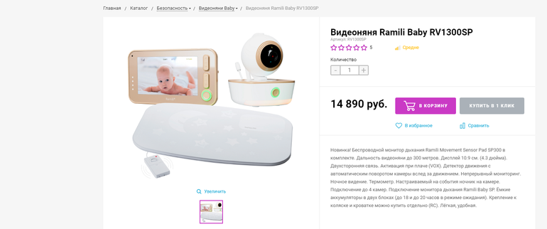 1) Видеоняня Ramili RV1300 с монитором дыхания