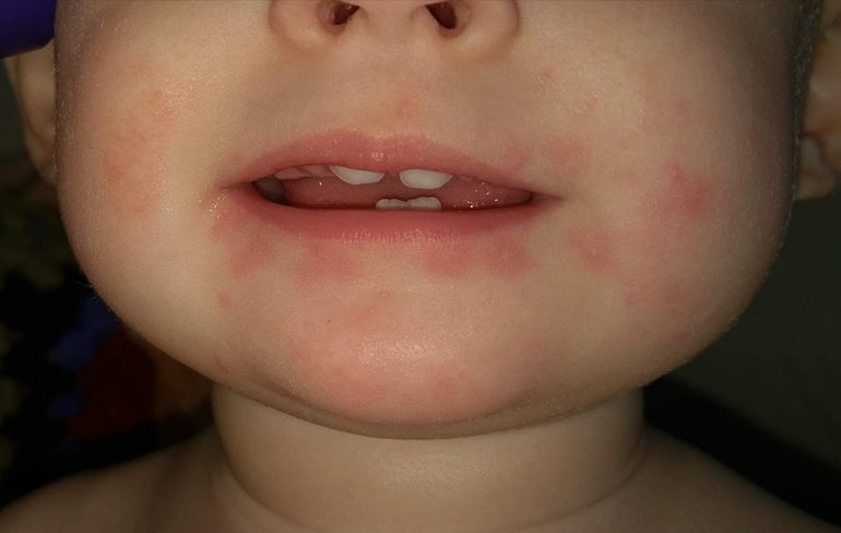 Вечером сегодня начался ужас! Появились пятна ярко розового цвета, на голове. Потом на щеке. Через 10 минут вокруг рта, подбородок, через 10 ещё минут по спине и рукам пошла Красная мелкая сыпь и пятна.