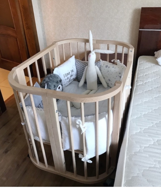 2. Кроватка SooHoo pappy. Форма прямоугольная, с как бы сглаженными углами. Дно у неё регулируется, боковушка снимается, она широкая, заявлено что до 1,5-2 лет ребёнок в ней спит, а потом есть возможность расширения до 7 лет за доплату, но думаю что этой функцией мы не будем пользоваться.