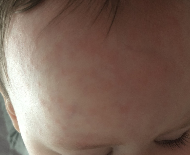 Высыпания на кожеДочка проболела, три дня была высокая температура, плохо сбивалась, плюс красное горло. Температуры нет уже 1,5 суток, но вот вчера днём появилась сыпь. В основном сыпь находится на лбу и за ушами, чуть чуть на спине и в складках шеи. Но вот на лбу она какими то пятнами, а на спине именно, как мелкая сыпь. Врач придёт сегодня после обеда. Думала может аллергия, из еды ни чего нового не ела, да она вообще за эти дни можно сказать только на груди, единственное купила новый гель для стирки, с рождения дочки использовала другой, но его сейчас нет. Потом думала может потничка, дочка в эти дни очень сильно потела, особенно в этих местах где сыпь, ну и плюс уже не мыли ее 4 дня. Хотя посмотрела потничка вроде по другому выглядит. Пишут ещё про розеолу, но там вроде сыпь только на теле, лицо не затрагивает. Фото по кат.