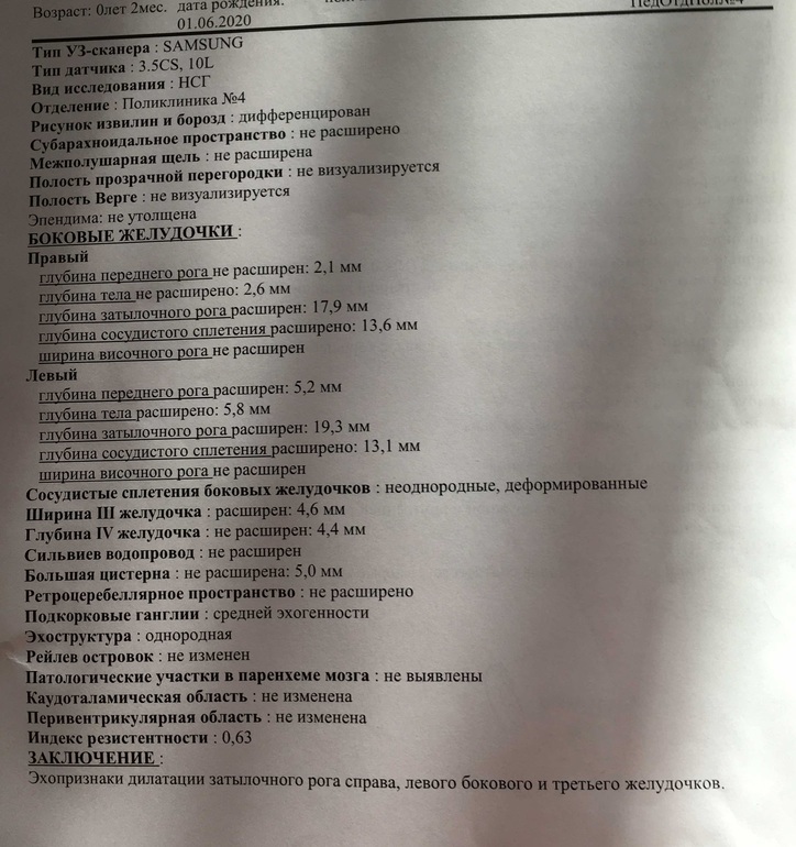 У нас глубина затылочного рога 12, ничего на УЗИ не сказали что расширен. Невролог посмотрела результаты, пока ничего не назначила нам. Велела делать гимнастику, спать больше на св. воздухе, в 3 мес УЗИ повторить