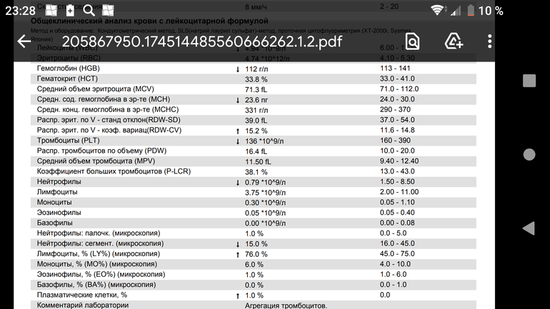 Спасибо. Думаю, тромбоциты могли упасть вследствие аггрегации, а аггрегация из-за того, что кровь из пальца. За нейтрофилы тоже подумала, что следствие вируса. Но раз вирус ушёл, как и пришёл, надеюсь, волноваться не стоит.