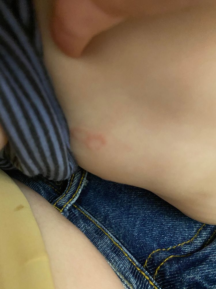 Кожные заболеванияВсем привет. У сына вот такое странное высыпание на груди. Не приходит второй день. Не чешет. Подскажите? Похожа на лешай. Дома живет собака, с другими собаками не контактирует