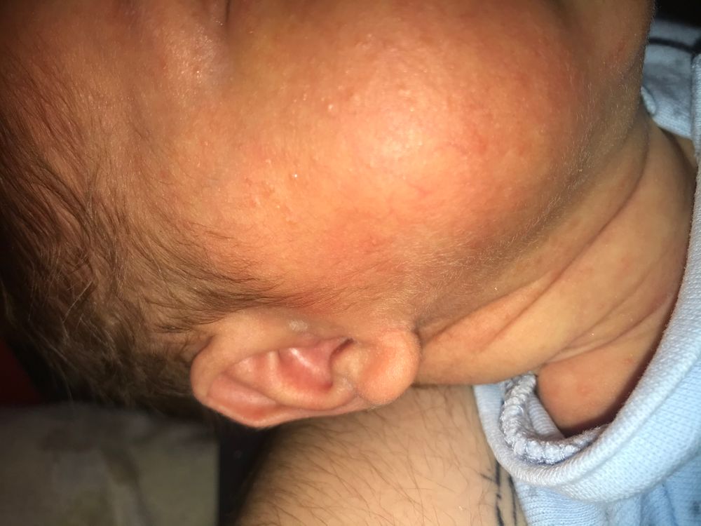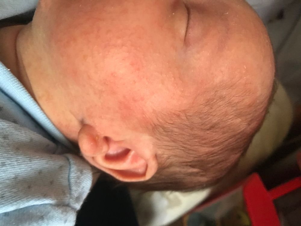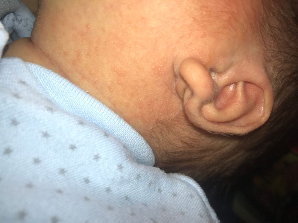 У нас тоже такая сыпь была где-то в течении месяца. Старалась, чтобы лицо ребенка не контактировали с тканью, чтобы не раздражать кожу ребенка.