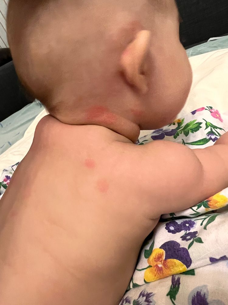 Высыпания на кожеК врачу завтра, но, конечно, не терпится услышать опытных мамочек, иначе ночь не буду спать. Нам почти 5 месяцев. Пару дней назад появились такие красные пятнышки на воротниковой зоне, подбородке и спине немного, на которых были маленькие белые прыщики.
