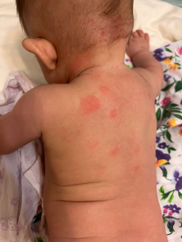Мазала судокремом и эти пятна стали немного шершавыми. Мы на ГВ и раз в день с рождения даем смесь НАН эксперт про тройной комфорт. Купаю без средств гигиены. Несколько дней назад поела немного арбуза буквально несколько ложек, одну помидорку со своей теплицы, еще от старшенькой на столе был кусочек недоеденного шоколада, я его проглотила)) до этого я такие продукты не ела. Еще я заметила, что высыпания появились после того как одевала ей теплый комбез на улицу изнутри утепленный шерстяной.