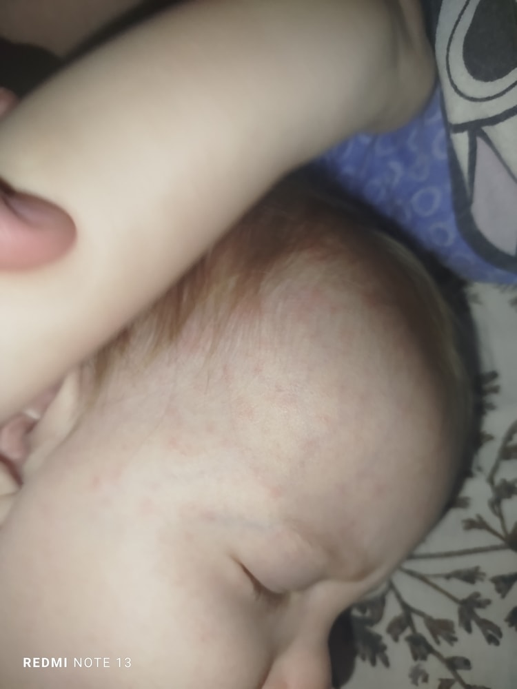 В среду поднялась температура, держалась до вчерашнего дня 38-39. Вчера появились вот такте пятная на лбу, щеках, спине, груди и на животике