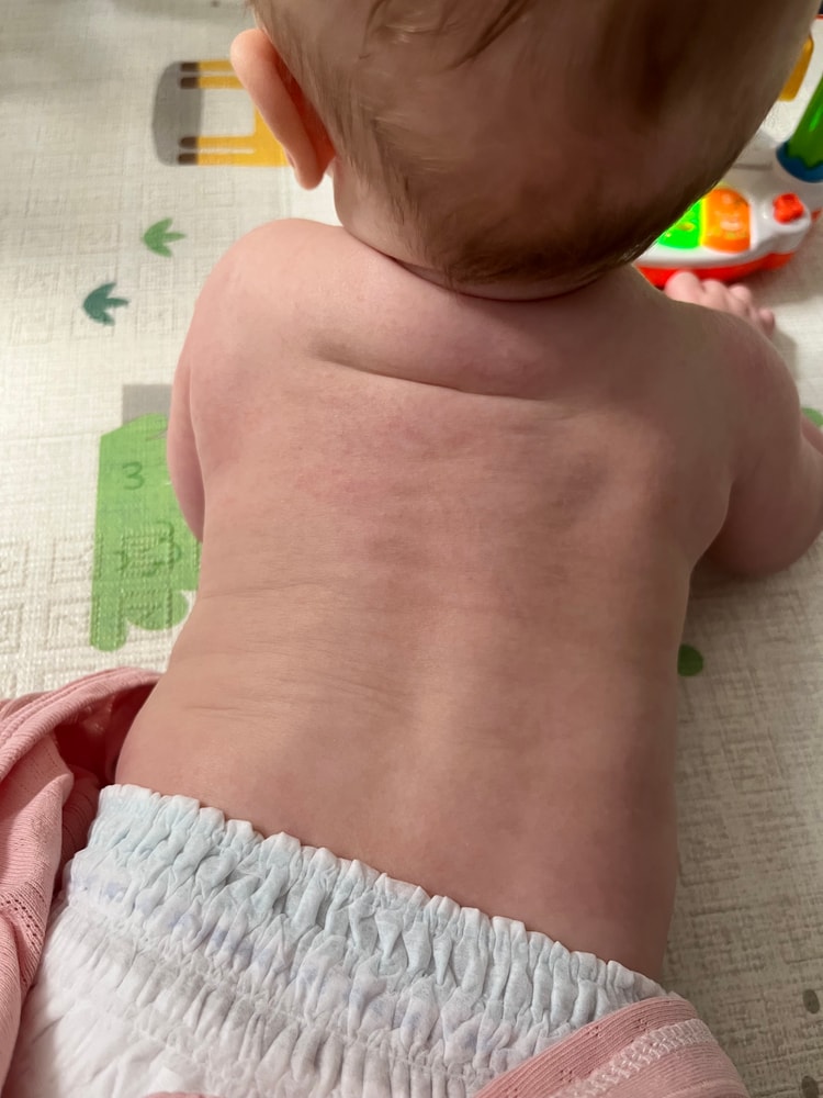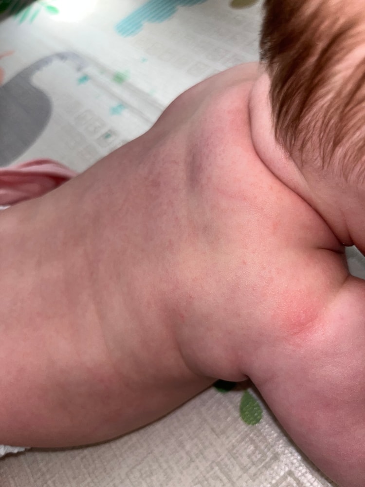 Через дня три массажей заметила что появляются мелкие прыщики, потом были праздники(4 дня выходных от массажа) и они чуток подушли. С понедельника этой недели снова начали массаж , снова появились прыщи. Вчера предпоследний день был и заметила чета очень много прыщей на спине (прикреплю фото), на локте, возле воротника и редкие на пузике. Это потница или аллергия? просто еще и массаж совпал с жаркой погодой(19-25 гр), и мы ездили в шапочке и комбезе плотном(но хлопковом). И если это потничка, то чем лечить, кроме воздушных ванн?