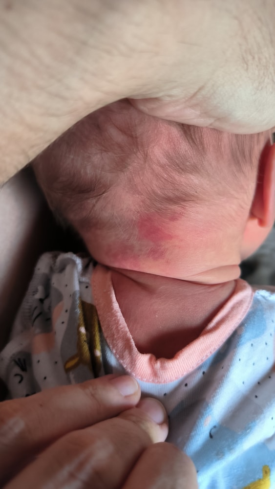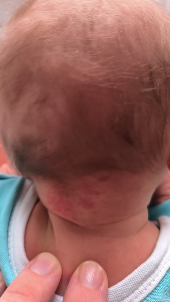 Это укус аиста, не опасное и не требует лечения) у нас такое же, но еще и на лице было. На лице прошло, а на затылке говорят 50/50 может и не пройти вообще, у нас сейчас оно стало чуть-чуть бледнее, думаю совсем оно не пройдёт