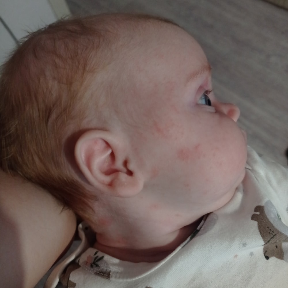 Высыпания на кожеСперва думали аллергия на что то, тк мы на св, но ничего аллергенного я не ела в последнюю неделю. Давали фенистил, тоже не прошло. Педиатр сказала просто наблюдать... Акне?