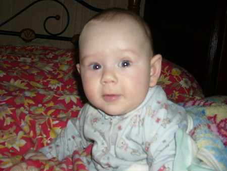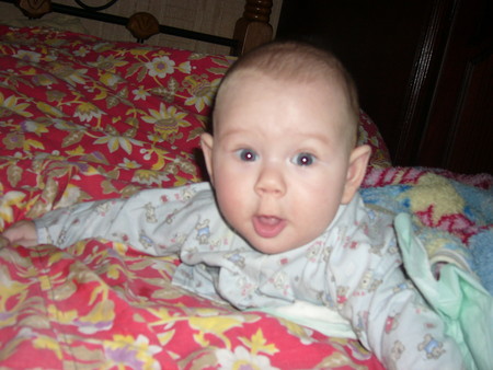 В начале недели заметила что Богдашка встает на ручки,и пытается ползти назад.Вперед не получается, наверное потому что еще руками пока не передвигает.Я его зафоткала за этим делом))) (фото правда мутноватое получилось).