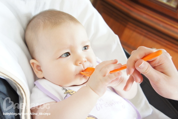 Начали неделю назад прикорм! ОЧЕНЬ ей нравится! Когда видит баночку, как я из нее выкладываю в тарелочку ее порцию, Аксюню аж трести начинает!