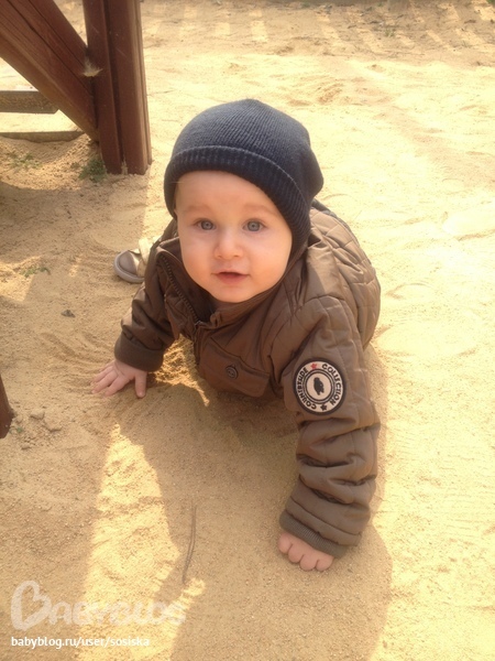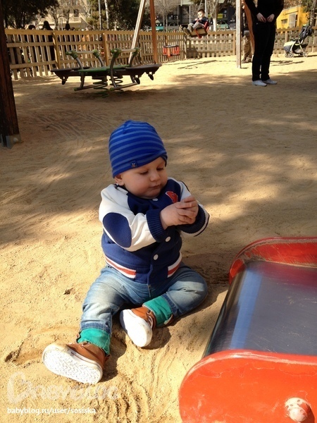 Мы ходили на детскую площадку которые, кстати, там огорожены заборчиком с дверцей, поэтому можно безбоязненно выпустить ребенка поползать. Катались на горке, пока он этим не особо вдохновился больше нравилось взбираться на нее. Качались на качели. Но самое большое впечатление произвел песок, пускал струйки, ковырялся пальцами, в общем, когда стали уезжать набрал кулаки песка, хотел взять с собой. К детям не особо проявляет интерес, хотя к нам пытались пристроиться пару детишек поиграть.